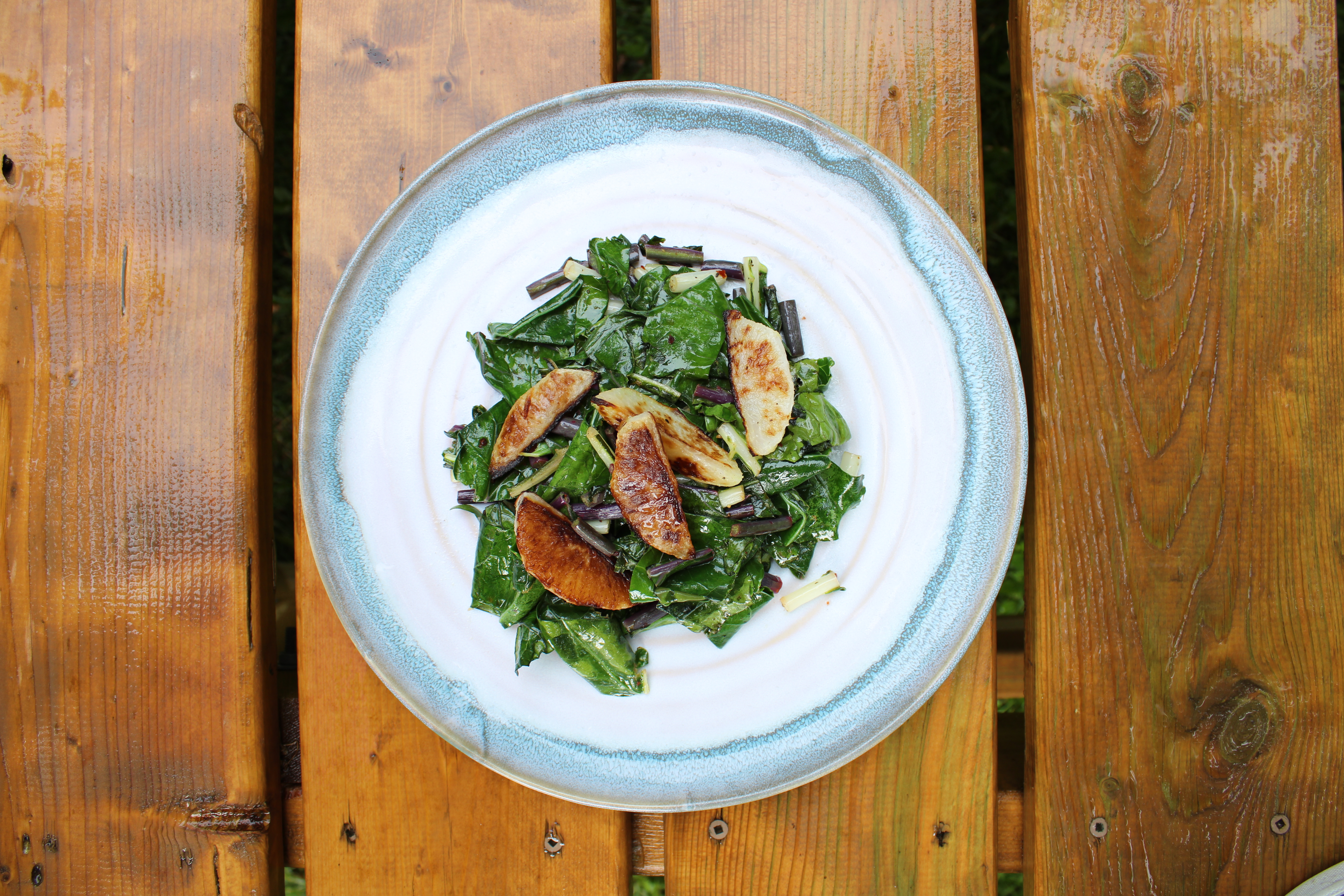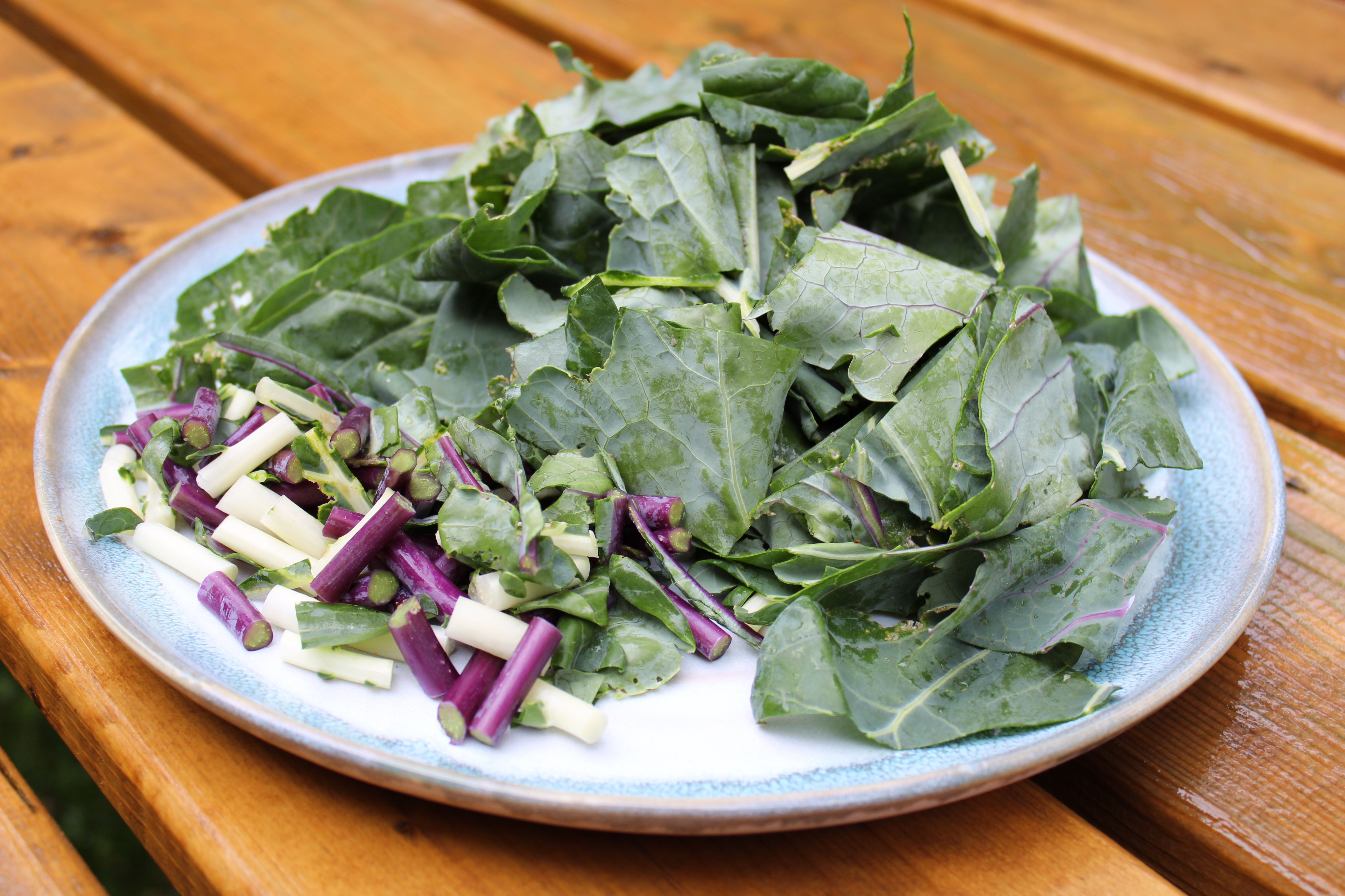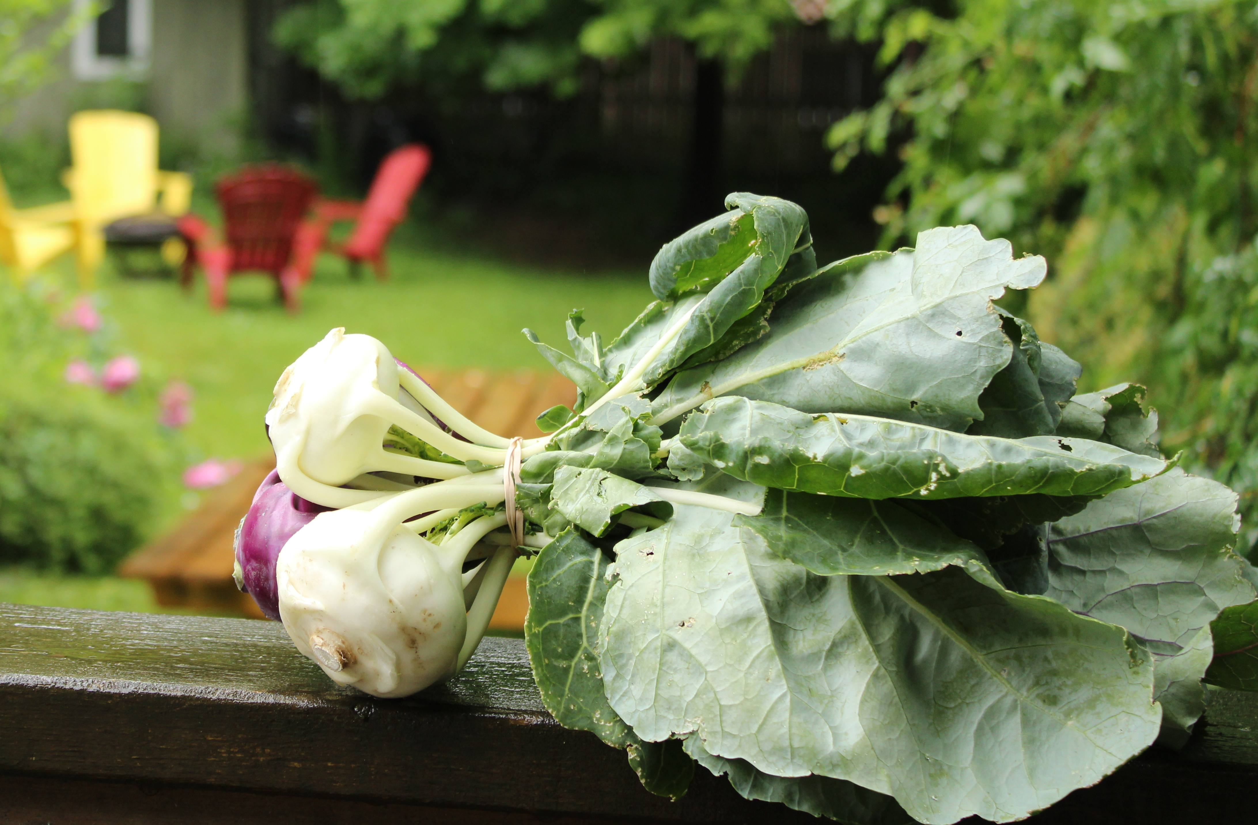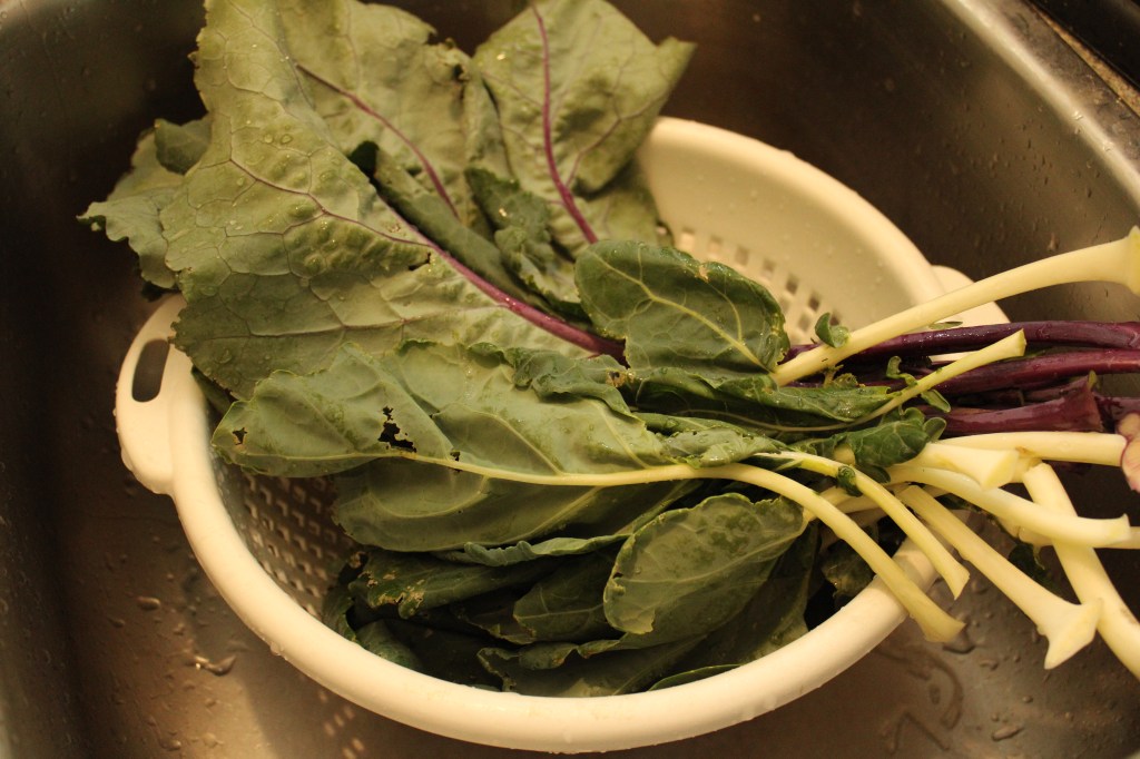 The kohlrabi leaves and their stems can be sautéed with any seasonings you see fit. Just add oil to a hot pan, cook the stems for a few minutes first then add the leaves. Add seasonings as you cook and be sure to taste the leaves. You may be surprised at the amount of seasoning you will need to add, so tasting as you cook will let you know how to adjust your flavors. I recommend frying some garlic before adding the leaves and squeezing lemon juice on the leafs once they are done cooking. The lightly fried garlic will add sweetness and the lemon juice adds a sharp tang that will go well with the bitterness of the leaves. If aren’t satisfied with the leaves try reducing some cut up bacon pieces in a pan; add the leaves to the cooked bacon meat and reduced bacon fat. Bacon will add both sweet and salty flavors that balance perfectly with the strongly flavored leaves.