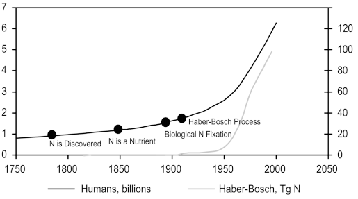 Early in the 20th century, when there were less than 2 billion people on the planet, the Haber-Bosch process was developed: this allowed mankind to synthesize Ammonia (NH3) from the atmosphere. Since then, the human population has been growing like crazy as well: today 8 billion people rely on synthetic nitrogen for their daily bread.