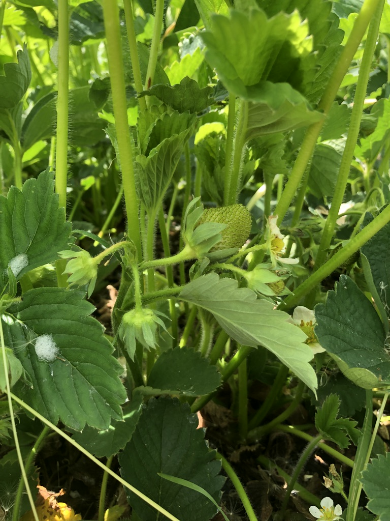 So in lieu of selling you strawberries covered in bitter tasting copper, or full of chemicals whose names I can’t pronounce, what we have been attempting to utilize instead of these are probiotic bacteria (Bacillus subtilis) that colonize and coat the surface of the strawberries before the bad guys can. Even when trying to use “natural” and “organic” products, the spray we are using, Serenade, is brought to us by the world’s biggest drug company: Bayer – there is no escaping these guys. Current conditions are going to push mold pressure to the max, so we will see how well this stuff works.